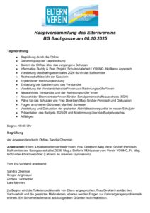Die Hauptversammlung des Elternverein Bachgasse findet einmal pro Schuljahr statt. Dabei präsentiert der Vorstand des Elternvereins was im vergangenen Schuljahr mit den Beiträgen der Eltern geleistet werden konnte und gibt einen Ausblick auf die Budgetplanung für das aktuelle Schuljahr.